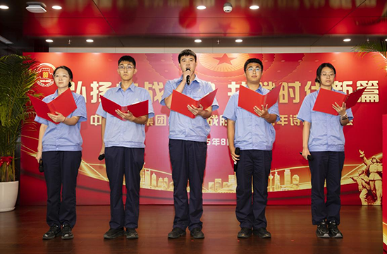 活動在莊嚴熱烈的氣氛中拉開帷幕。主持人宣布活動開始后,來自集團各單位的16支代表隊依次登臺,圍繞“烽火淬煉山河志”“鐵骨赤忱鑄脊梁”“初心如炬傳薪火”“盛世逐夢啟新程”四個篇章,深情朗誦了《如果我生活在那個年代》《我的抗戰》《槍響處 山河醒》《詩頌風華》《鋼槍與塔吊的變奏曲》《與夢同行》《詩意中國》等一批優秀原創及經典詩歌作品。