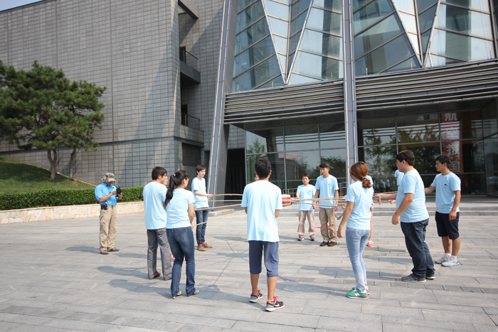 學員們在教練的指導下練習拓展項目“龍行天下”