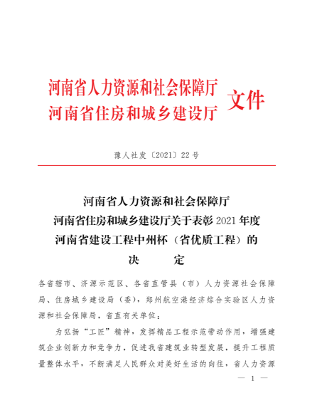 據(jù)悉,“中州杯”獎是河南省建設(shè)行業(yè)工程質(zhì)量的最高榮譽(yù)獎項,本次評選范圍為河南省行政區(qū)域內(nèi)2017年6月30日—2020年6月30日期間完成竣工備案,并經(jīng)過一年以上使用沒有發(fā)現(xiàn)質(zhì)量缺陷和質(zhì)量隱患的新(擴(kuò))建工程。“中州杯”由河南省住房和城鄉(xiāng)建設(shè)廳組織評選,每年評選一次。