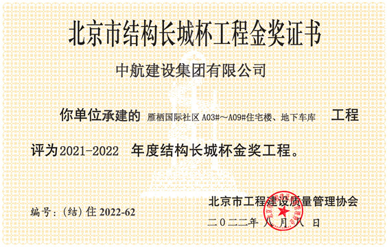 經北京市優質工程評審委員會專家組評檢、推薦、審議,2022年8月8日,由集團公司承建的陳各莊集體土地租賃住房項目(又稱“雁棲國際社區”項目)被評為“2021-2022年度結構長城杯金獎工程”,10月11日正式獲得獎杯和證書。